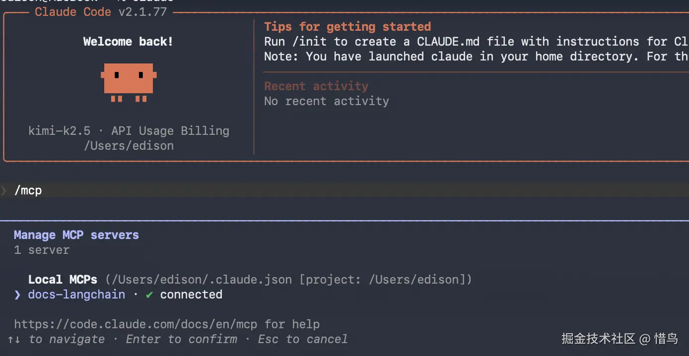 在 claude 输入 /mcp 查看配置的 mcp 列表: