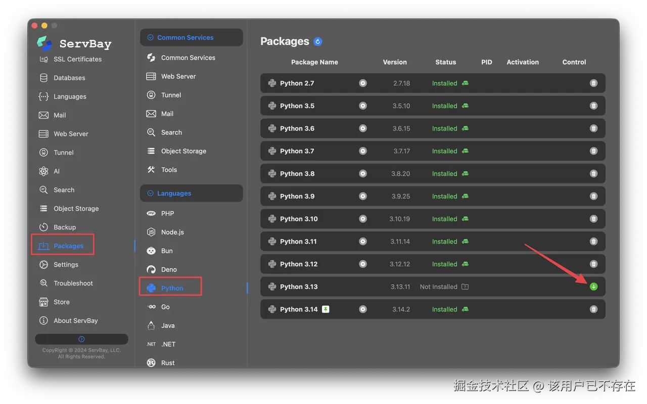 对于不希望手动配置环境变量或处理各种依赖冲突的用户,推荐使用 ServBay。这是一款开发环境管理工具,支持一键安装 Python 以及各种数据库和服务。