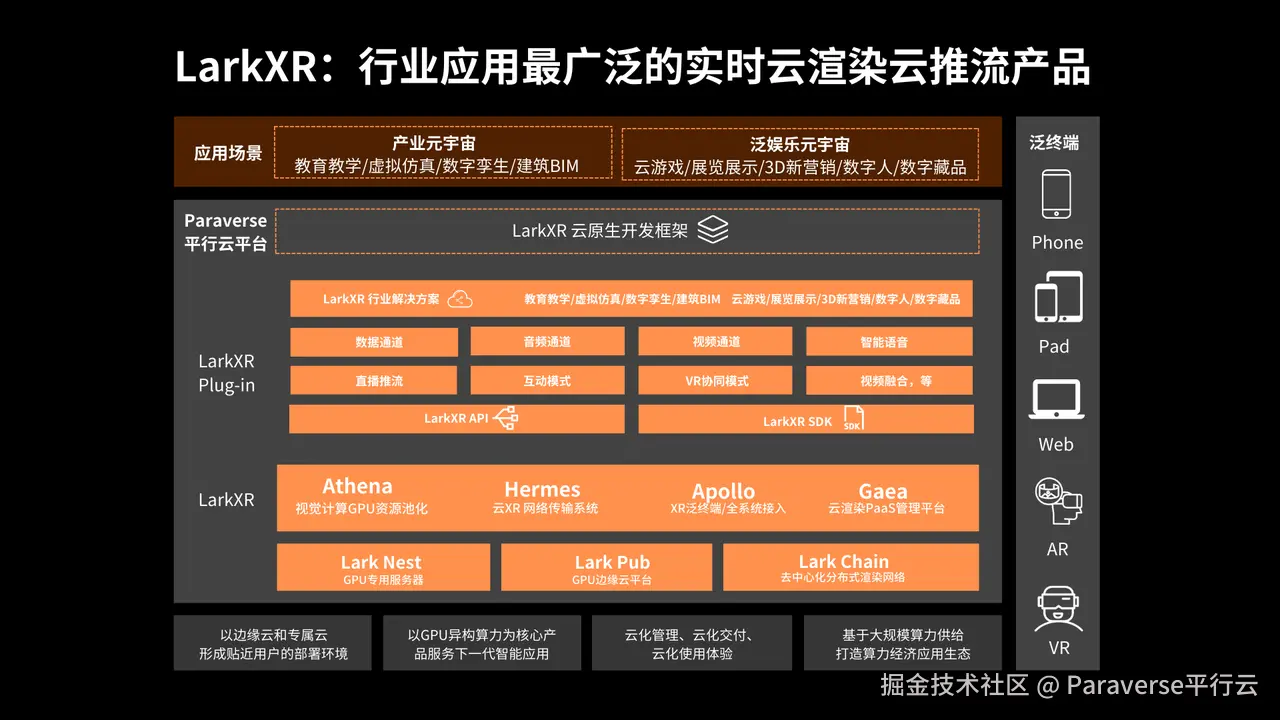 与UE的像素流送插件相比,LarkXR提供了一个完整的、开箱即用的PaaS平台解决方案。像素流送仅相当于LarkXR中的流式传输模块,而LarkXR则覆盖了从云端算力与应用管理、网络层流式传输优化,到异构终端接入的全流程。