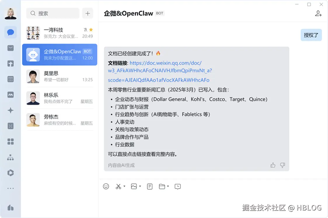 1. 可直接要求机器人操作文档,例如:“帮我搜集本周零售行业重要新闻,汇总成一篇企业微信文档”。机器人会自动发送授权连接,请你授权。