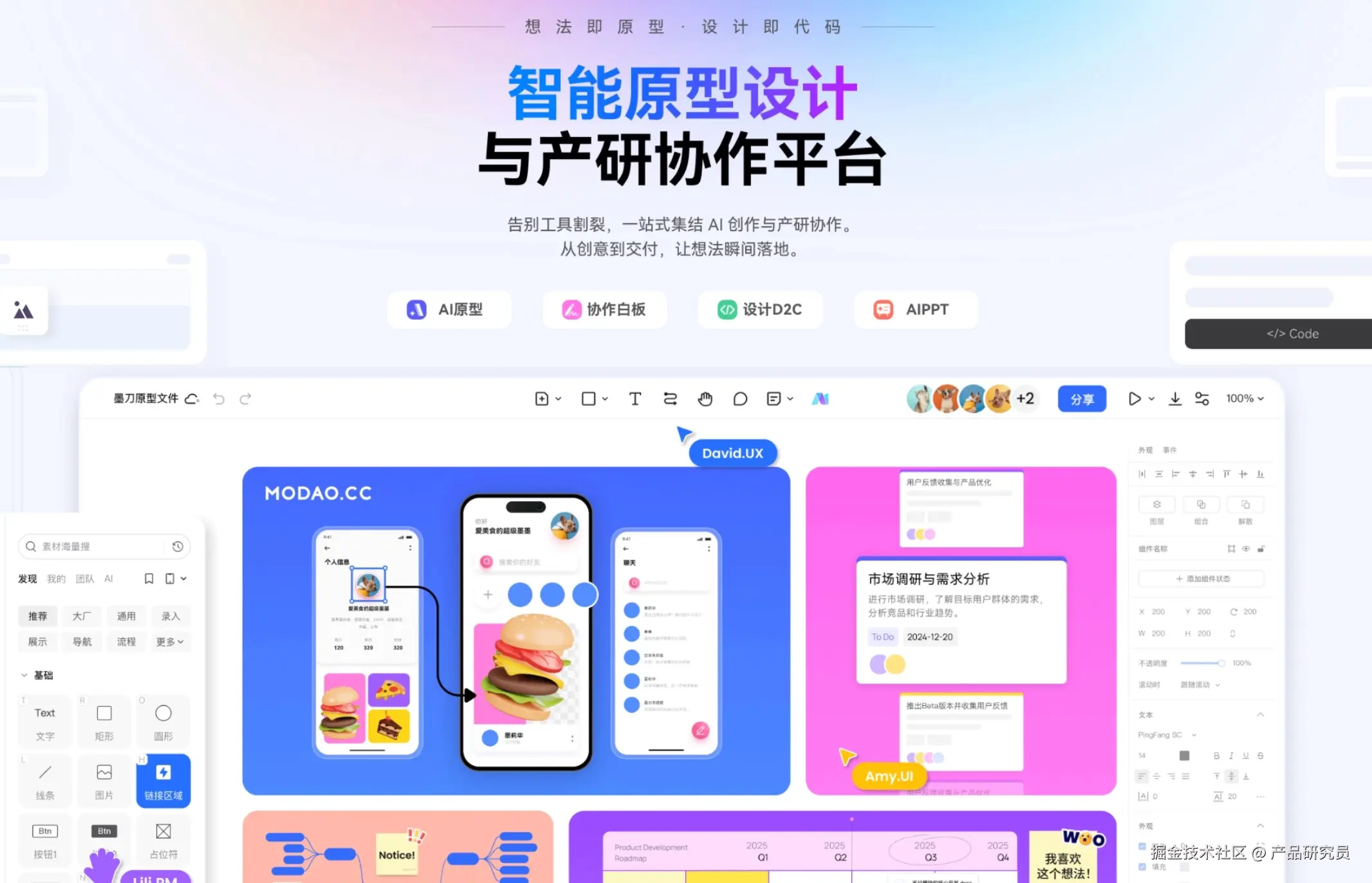 另外一个变化是,墨刀现在的“白板+原型+UI+协作”是一体的。你可以在白板上做头脑风暴,可以用 AI 一键生成原型初稿导出编辑,还能无缝衔接设计师画 UI、导出完整代码,更接近产研协作平台的形态。