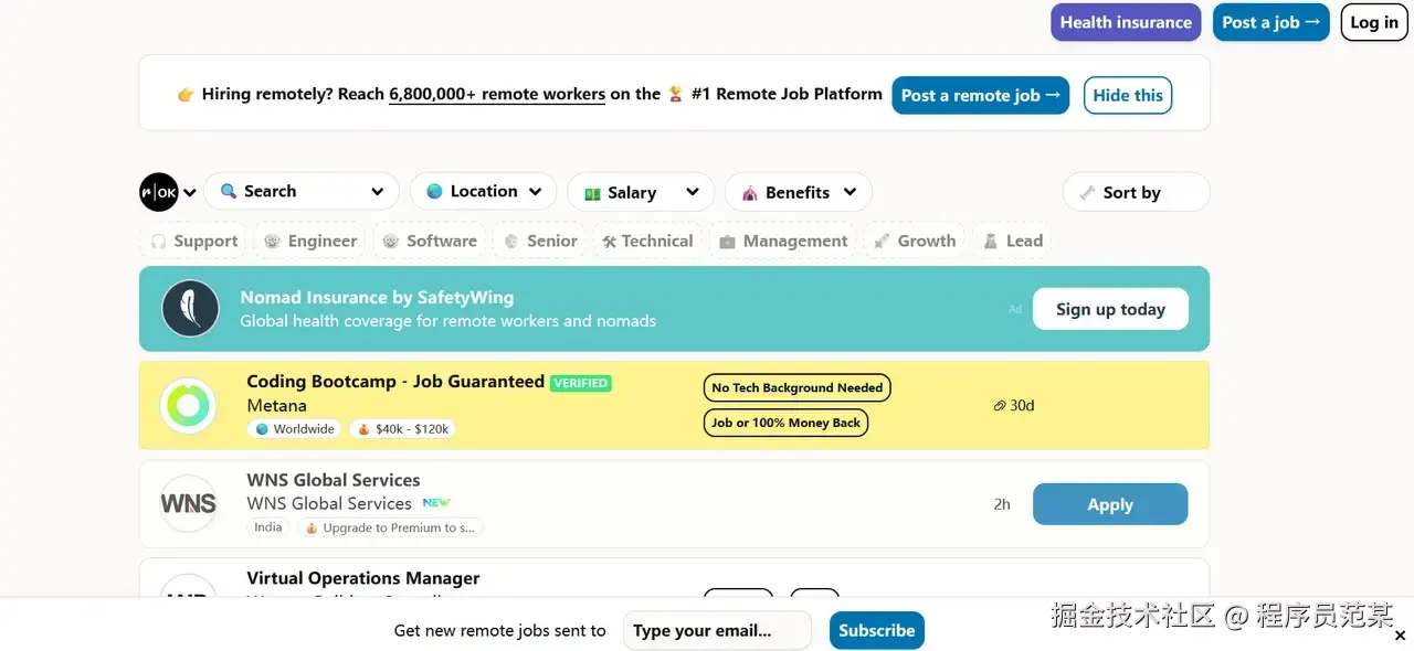 RemoteOK的开发人员兼职项目以海外科技公司和初创企业为主,项目质量普遍较高,薪资水平也相对有竞争力。平台支持订阅每日或每周的项目推送,通过邮件及时获取最新职位信息。适合希望建立长期远程合作关系的开发者。