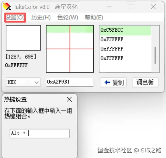 点击设置->热键设置,可以在下方面板中修改获取颜色快捷键。颜色吸取完成后,会在调色板中进行显示,点击复制按钮即可使用。