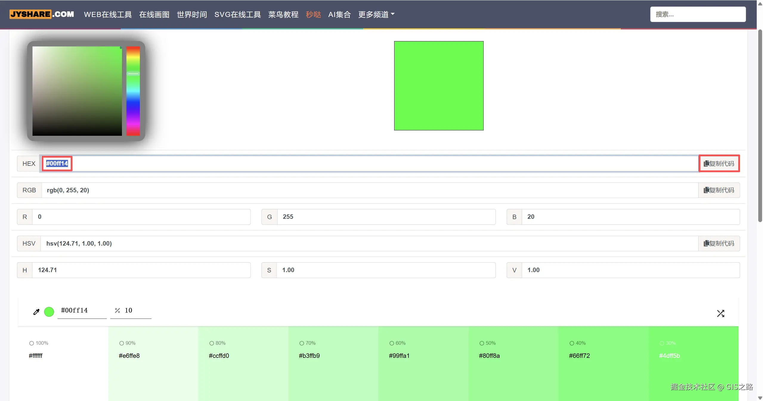 颜色模式支持HEX、RGB、HSV三种类型,点击颜色转换面板中的复制按钮或者直接选中颜色值进行复制。