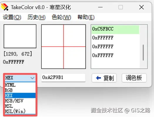 TakeColor取色器支持多种颜色模式,包括RGB、HEX、HSV、HSL等。