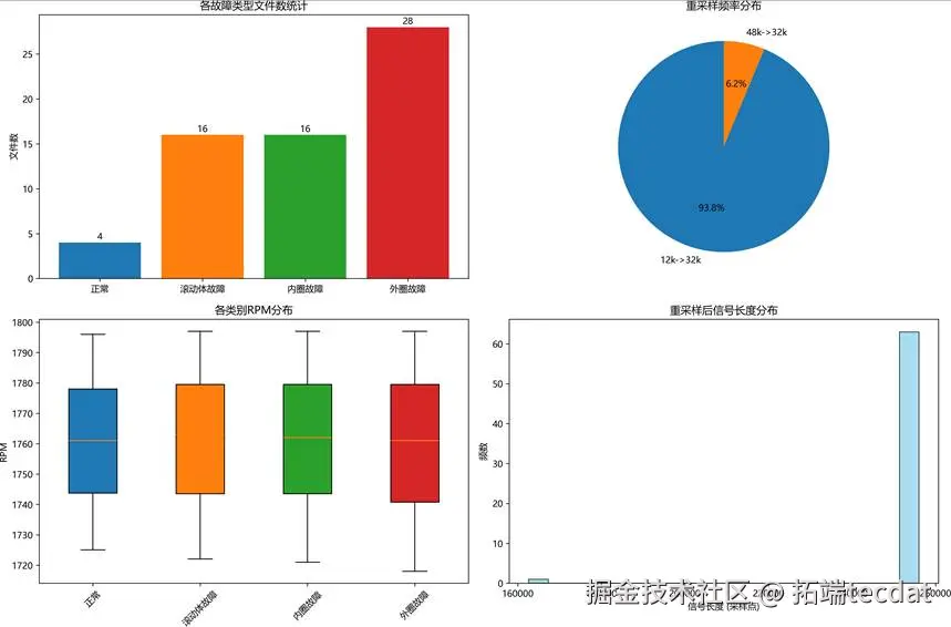 | 故障类型 | 文件数 | 样本比例(%) | RPM均值 | RPM标准差 | 总窗口数 | 采样频率 | 迁移适配性 |