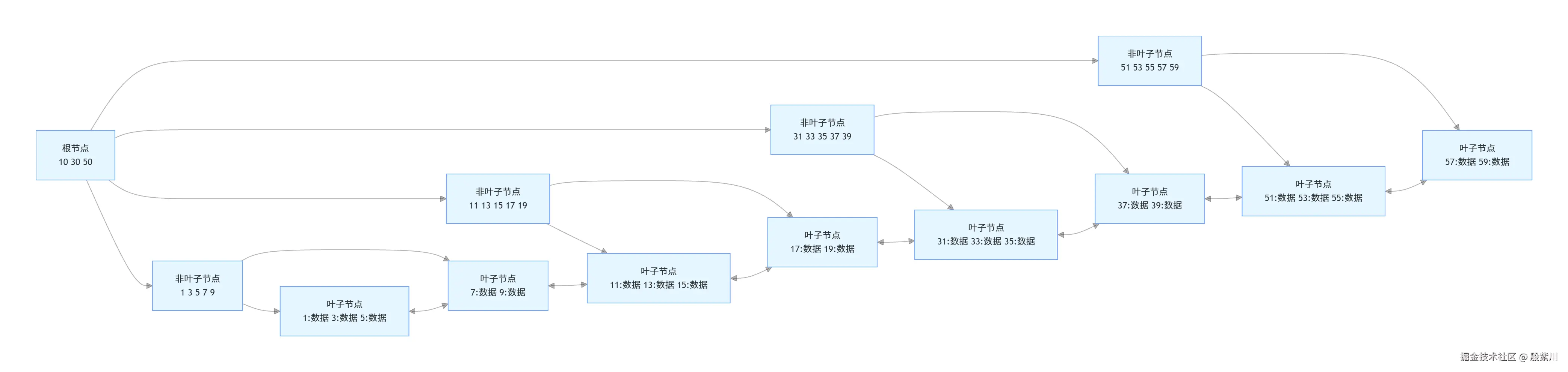 - 叶子节点是有序双向链表:所有叶子节点按索引键升序排列,通过双向链表串联,范围查询、排序、分页操作只需遍历链表即可,性能极高。