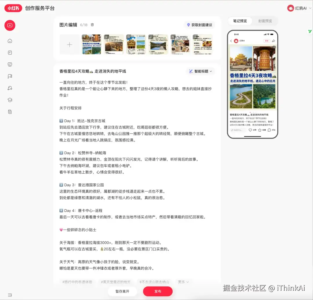 很多 AI 工具 生图就像开盲盒,风格一天一个样。如果你需要那种背景、色调高度统一的成套素材,尤其是做产品展示、旅游攻略或者专业领域的内容产出,【红鸦 AI】的表现非常老练。