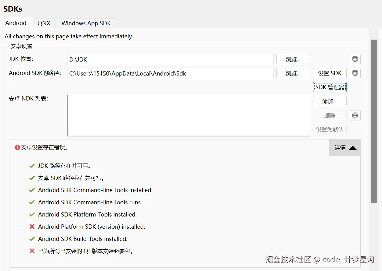 昨天的成果:下载了Android Studio、JDK,并把Android Studio的SDK和NDK、JDK的路径配置到环境变量里;安装了Qt,初步尝试了在Qt里配置安卓开发环境。