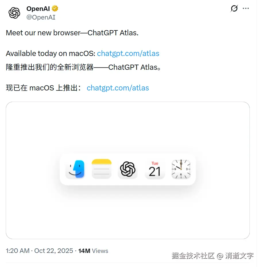 Atlas,AI 原生浏览器,目前只有 macOS。这个浏览器不是给你上网用的,是给 AI 上网用的。你让它去查个东西、抓个数据、跑个流程,它自己打开网页去操作。