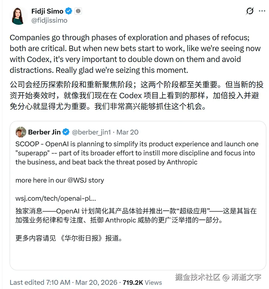 她还补了一句:不要被"支线任务"分心。这明显指的是 OpenAI 过去一年铺开的那些实验项目,Sora 视频、硬件、各种独立小产品。
