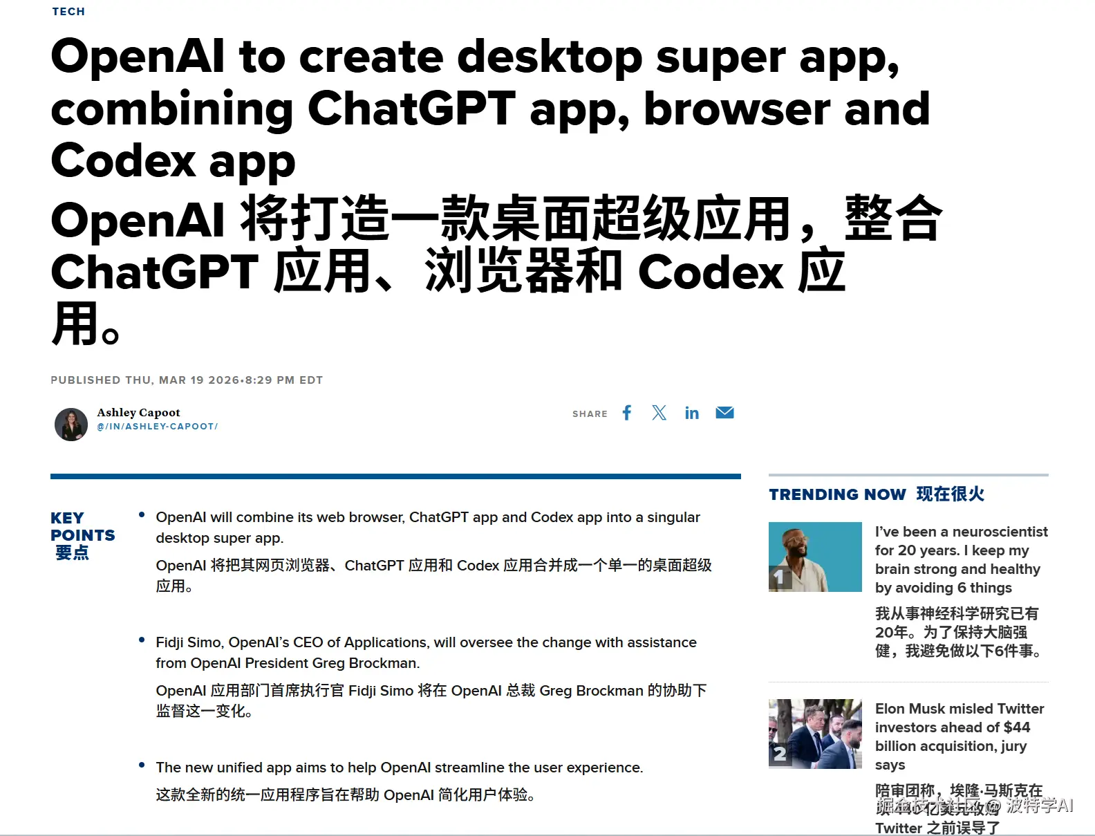 消息是华尔街日报先爆的,OpenAI 自己马上确认了。负责人是应用 CEO Fidji Simo,Greg Brockman 盯技术重组。