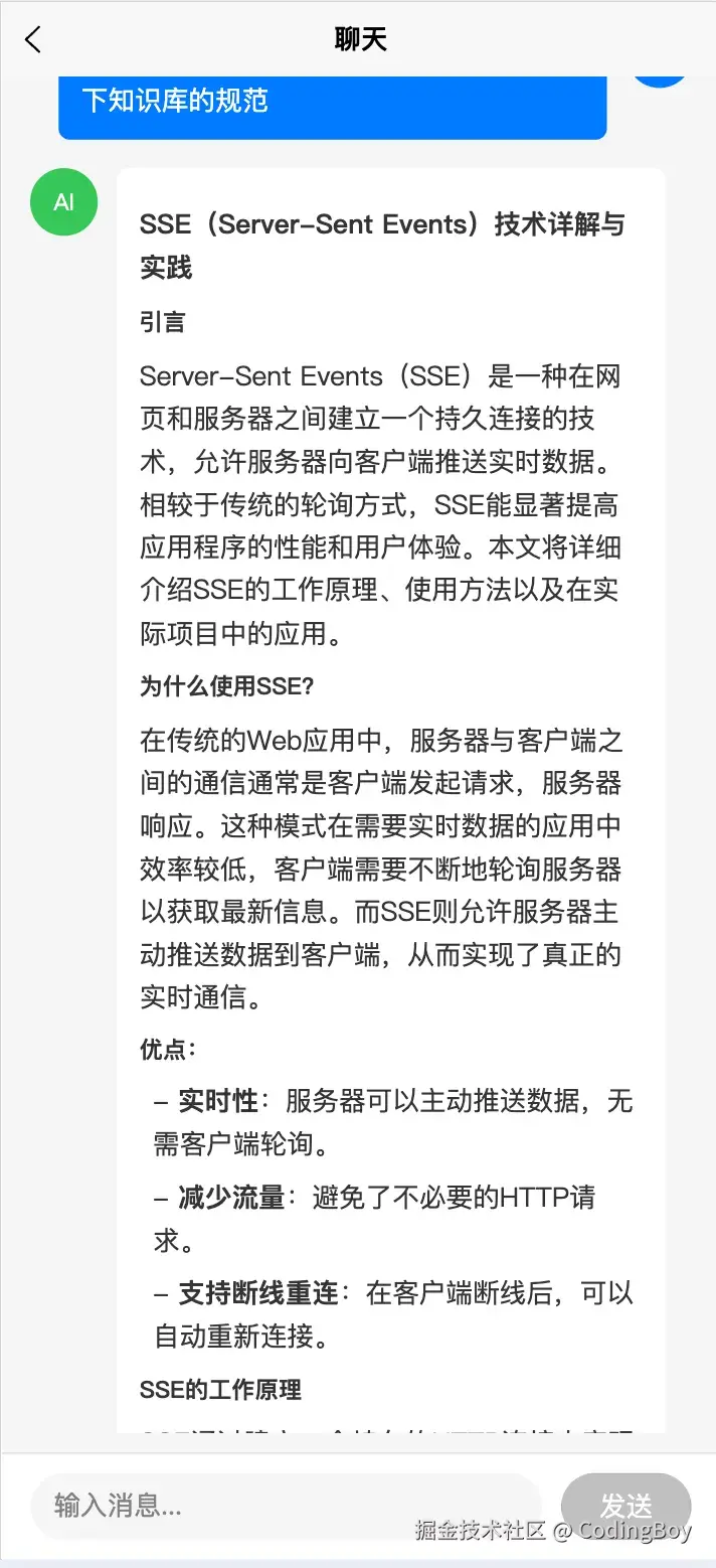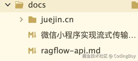 迷茫之际,我想到一个小技巧,就是谷歌一下,搜索“小程序流式数据处理”,找到了一篇我认为应该是有帮助的博客([微信小程序实现流式传输(打字机效果)]juejin.cn/post/728862…),然后我通过Cluade Code 将这篇博客转为我本地的docs文档并存入我的源代码目录。