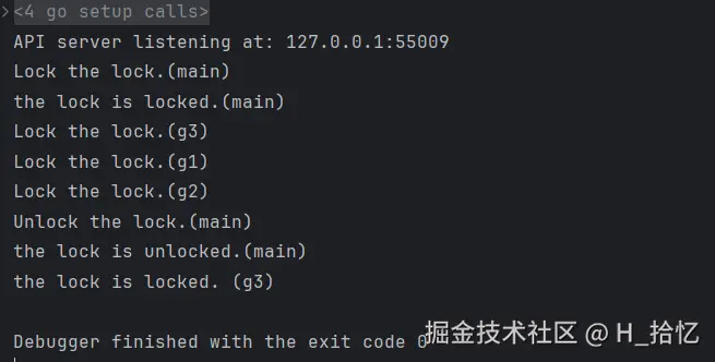 从上面的结果可以看出.main抢到锁进行睡眠的时候.g1 g2 g3都进行锁操作然后进入了阻塞.当main睡眠结束.释放锁之后.g3抢到了锁.