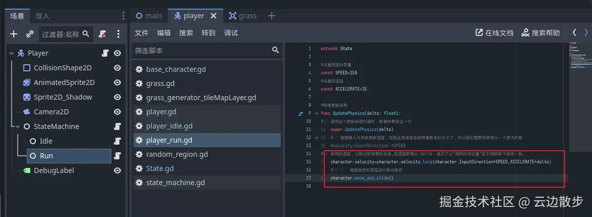 - 然后我们回到这个空闲状态脚本中,来进行更新物理函数,根据是否有输入来判断是否进行切换状态,这里进入奔跑状态