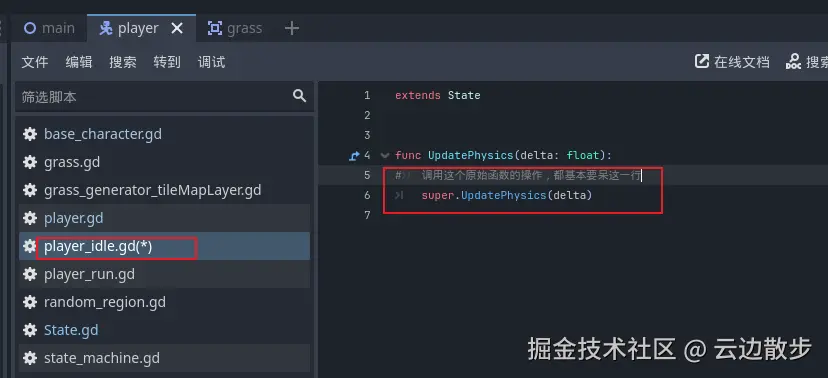 - 然后我们打开空闲状态的脚本,让我们重写状态类中的物理更新函数,我们去状态脚本那里把物理更新原始函数函数复制过来。大多数情况下当我们重写自己的函数时,我们需要先调用原始函数,因为很可能原始函数中还有其他操作。如果我们不先调用原始函数,那么原始函数中的那些操作就无法生效