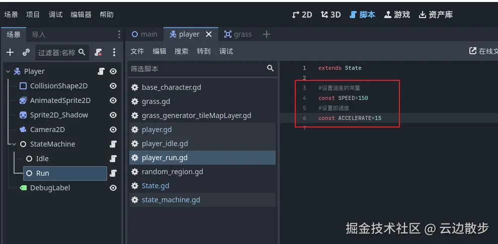 • 然后我们到奔跑状态的脚本中进行编写内容,首先我们需要速度和加速度常量,我们去玩家脚本中将其剪切出来,粘贴到这个奔跑状态中‘
