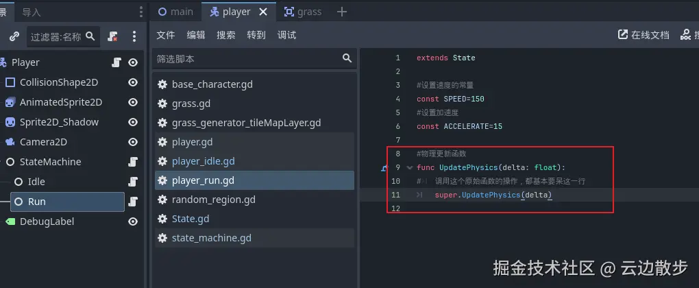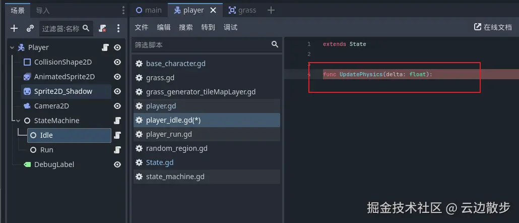 • 然后我们回到这个空闲状态脚本中,来进行更新物理函数,根据是否有输入来判断是否进行切换状态,这里进入奔跑状态