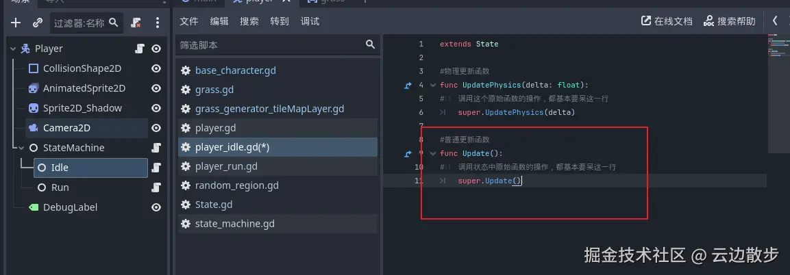 • 然后我们打开空闲状态的脚本,让我们重写状态类中的物理更新函数,我们去状态脚本那里把物理更新原始函数函数复制过来。大多数情况下当我们重写自己的函数时,我们需要先调用原始函数,因为很可能原始函数中还有其他操作。如果我们不先调用原始函数,那么原始函数中的那些操作就无法生效