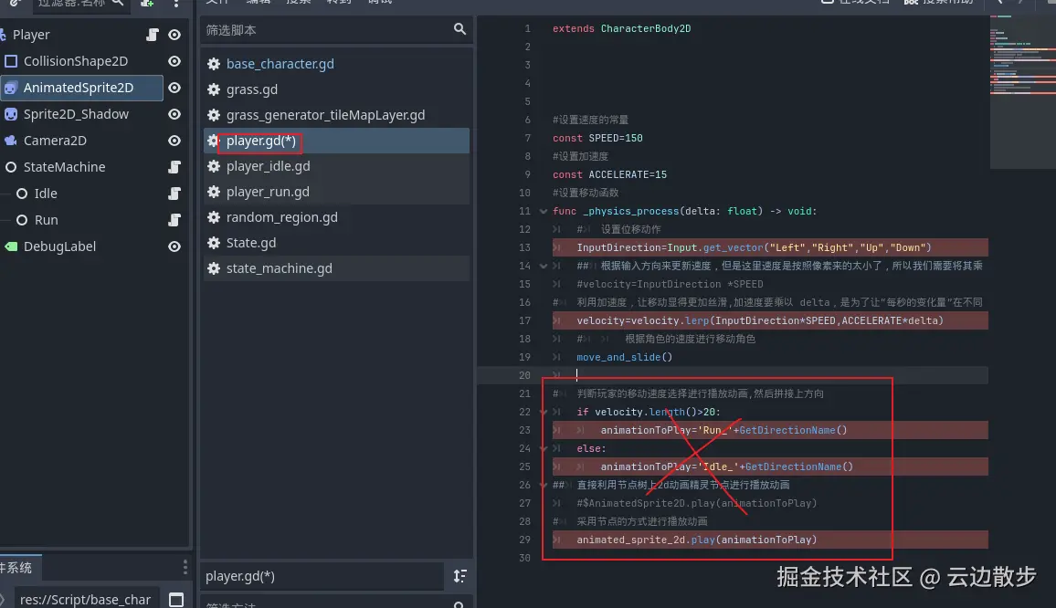 • 接着我们去玩家脚本移动一些代码到这里来成为公共的代码,笔者这里那个按ctrl进行拖动的2d动画精灵节点那行代码之前文章没放,这里要注意一下,按照图片中的来就对了