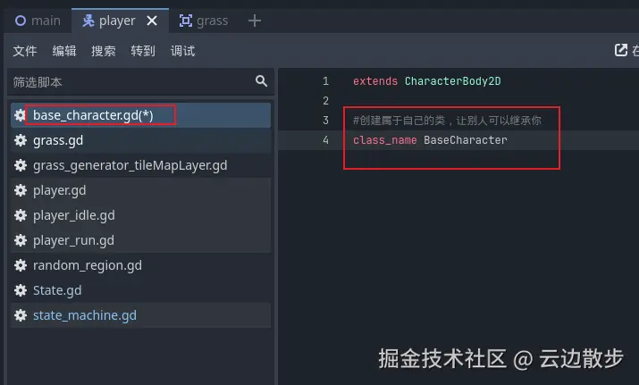 • 首先我们右键点击脚本文件夹新建一个脚本 ,因为玩家和敌人都是2d物物体,所以我们继承的类也是就是2d物理物体,然后重命名为base_character.gd