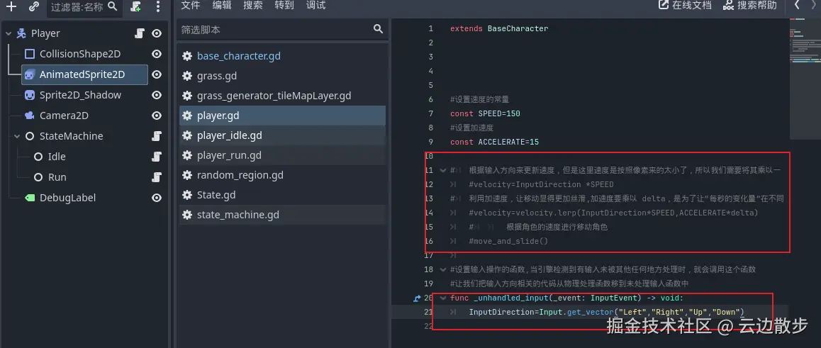 • 然后敌人是不需要进行输入操作的,所以我们在玩家脚本中,将输入操作构建一个新的函数来进行实现_unhandled_input,当引擎检测到有输入未被其他任何地方处理时,就会调用这个函数。让我们把输入方向相关的代码从物理处理函数移到未处理输入函数中,以及删掉之前的那个函数,并且在目前的事件参数前加一个下划线