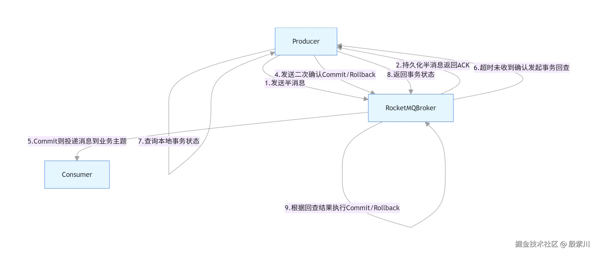 - 生产者根据查询结果,再次向Broker发送COMMIT/ROLLBACK指令,Broker重复步骤5的处理逻辑。
