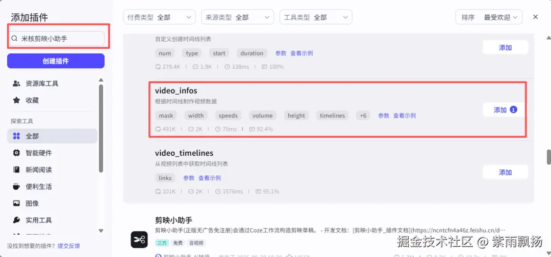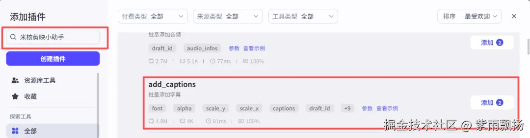 该节点的作用是将上步视频数据添加到剪映草稿,需要用到的插件是第三方的 【米核剪映小助手】 的【add_videos】