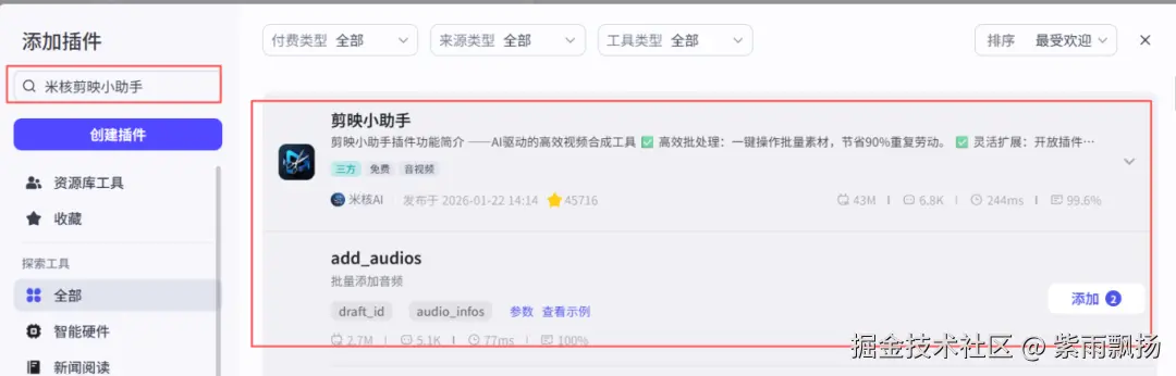 该节点的作用是添加背景音乐数据,需要用到的插件是第三方的 【米核剪映小助手】的【add_audios】