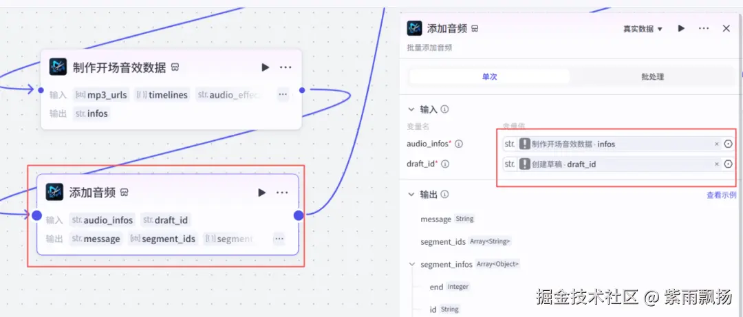 该节点的作用是制作开场音效数据,需要用到的插件是第三方的 【米核剪映小助手】 的 【add_audios】