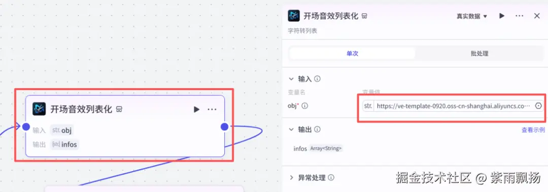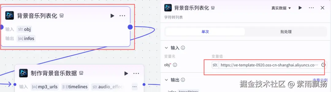 该节点的作用是制作开场音效数据,需要用到的插件是第三方的 【米核剪映小助手】 的 【str_to_list】