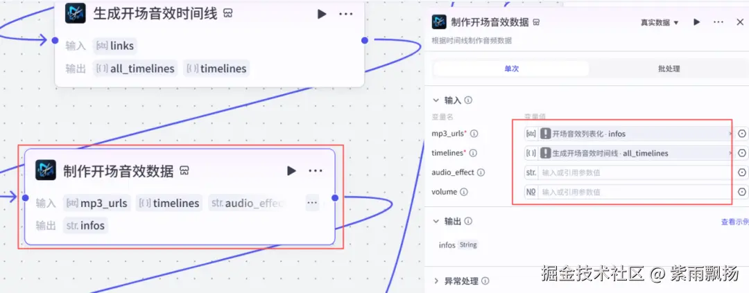 该节点的作用是制作开场音效数据,需要用到的插件是第三方的 【米核剪映小助手】 的 【audio_infos】