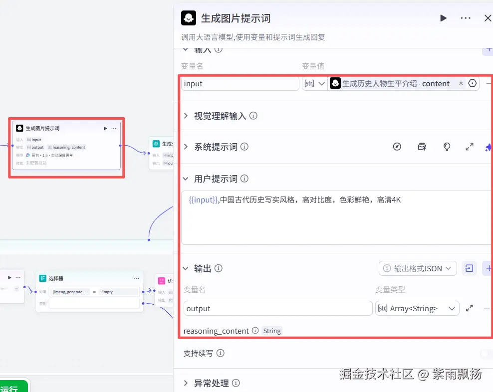 - 添加一个大模型节点->重命名为历史人物生平介绍->设置参数及提示词;