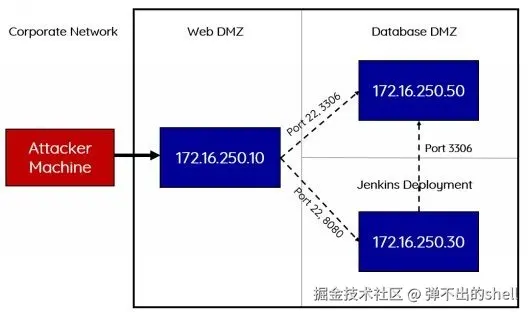 本次靶场共三台 Linux 主机,模拟一个典型的企业内网"站库分离"架构: