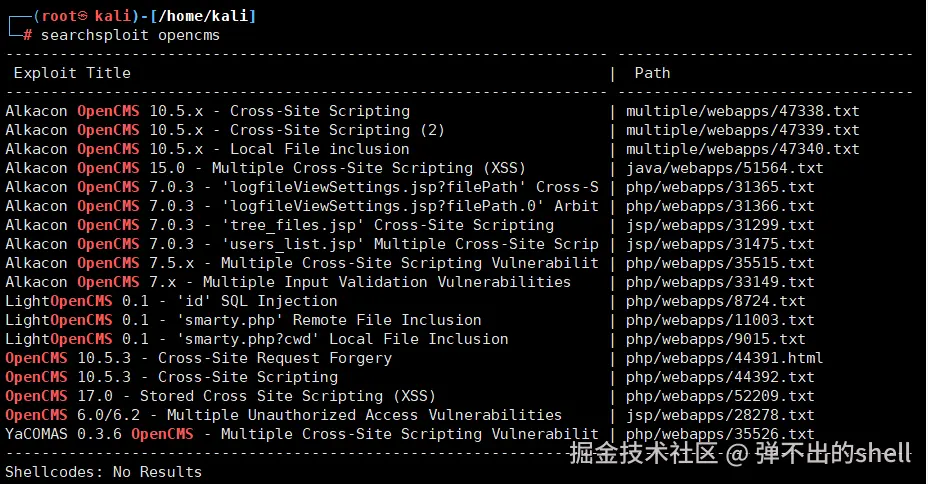 尝试在 Kali 上搜 OpenCms 的漏洞: