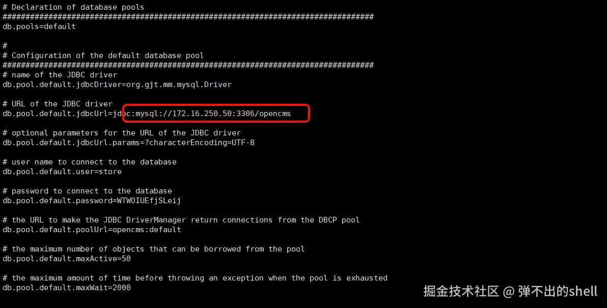 ├─ 读取 opencms.properties → 发现数据库IP(.50)