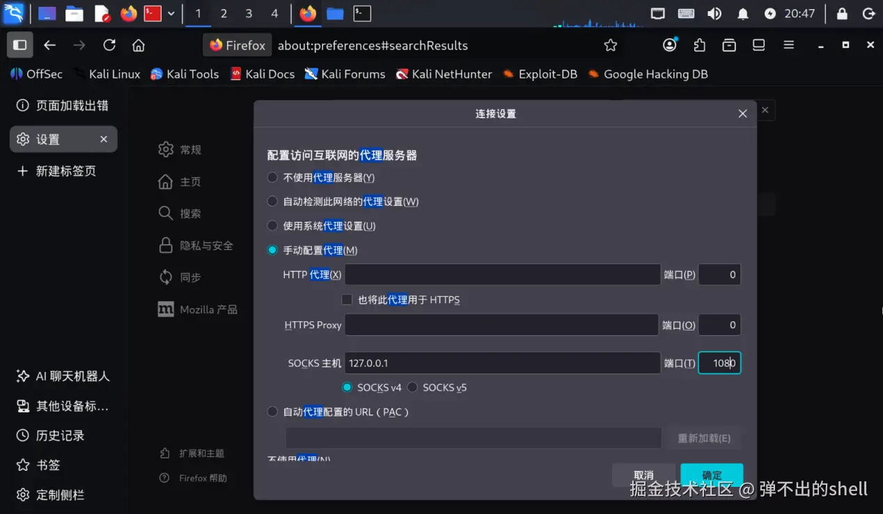 proxychains firefox结果不好使,有限制,比较麻烦,直接改浏览器代理配置更省事。