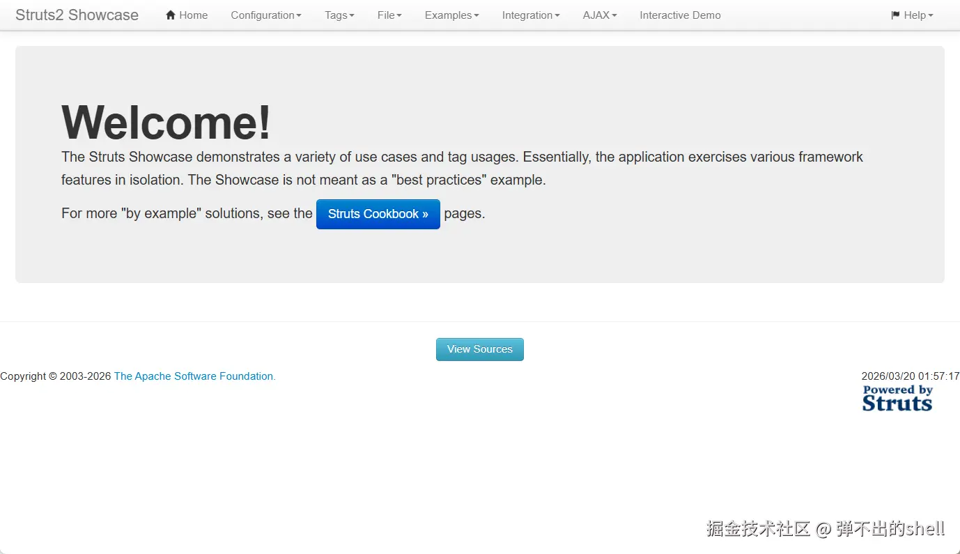 这是 Struts2 Showcase Demo,官方演示程序,很多靶场都会装这个当入口。看到这个基本就知道该怎么打了。
