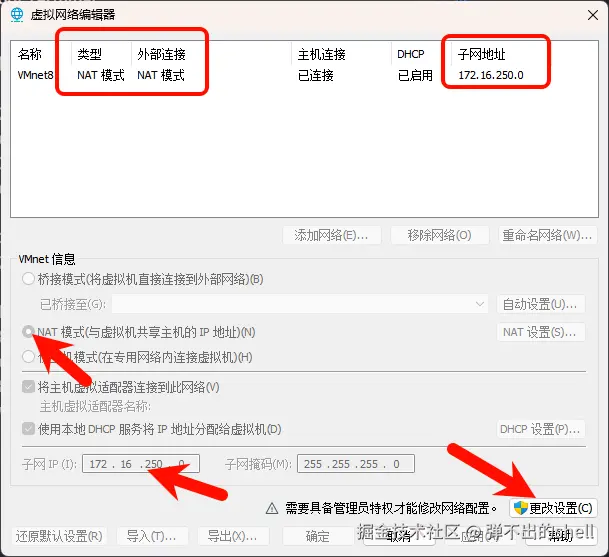 VMware 路径: 编辑 → 虚拟网络编辑器 → 更改设置
