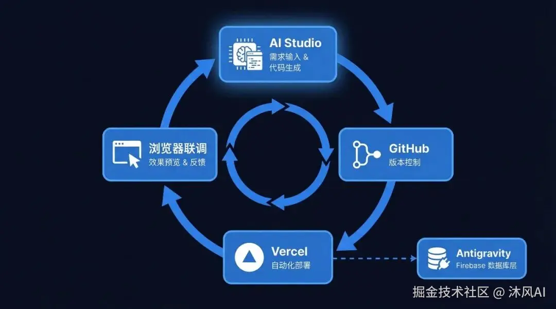 - • AI Studio + Antigravity 负责全栈开发,前端构建到后端部署一条龙