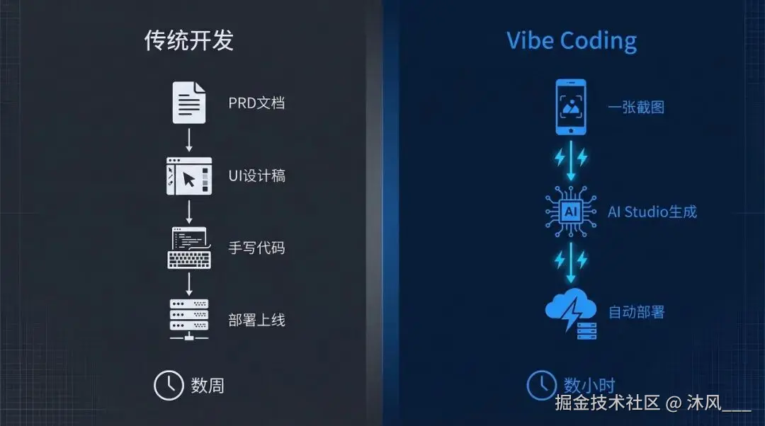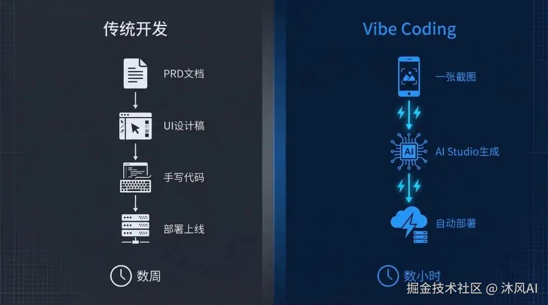 左边是传统开发范式:想法变成原型,需要数周时间,要写 PRD,要做高保真 UI,要手写逻辑,要反复 debug,还要搭服务器、配数据库。右边是 Vibe Coding 范式:一张截图加几句自然语言,数小时出原型,AI Studio 持续输出前端与交互逻辑,Antigravity 一键串联后端,自动推送至 Vercel。