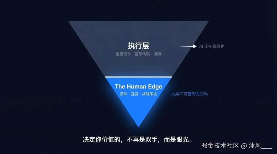 AI 正在把 80% 的执行层工作商品化。重复性设计、基础代码、排版——这些东西 AI 做得越来越好,成本越来越低,速度越来越快。