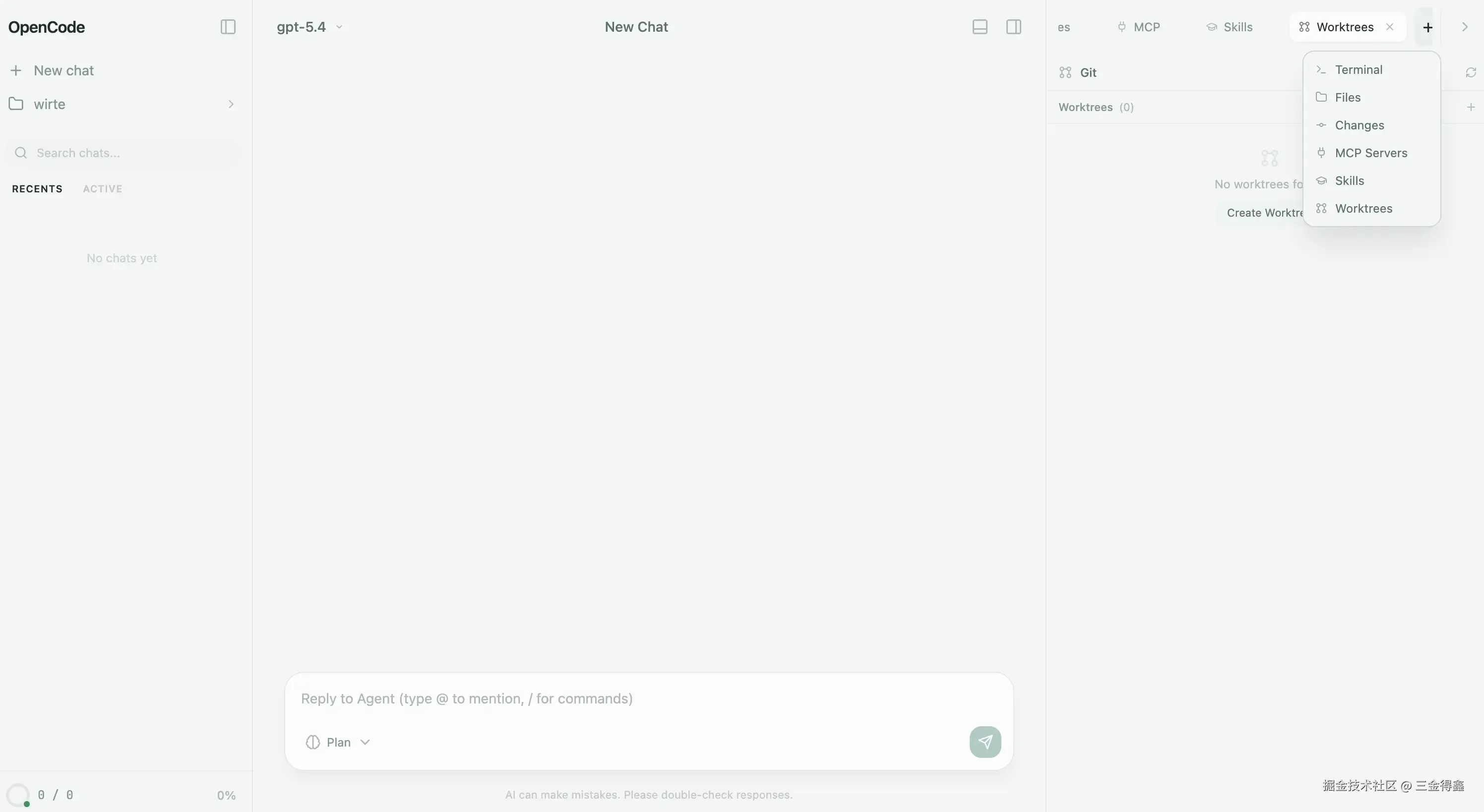 - 右边可以展示当前目录下的文件、修改的文件、Skills、MCP 以及 Worktrees。