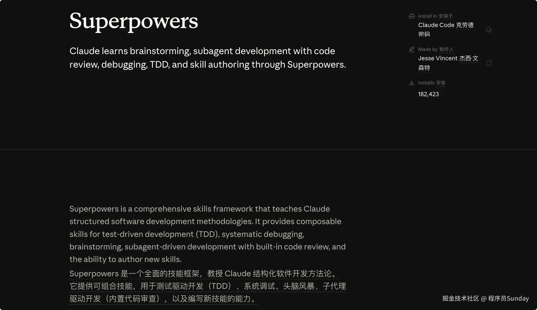 Superpowers 现在已经超过 100k stars 了(上午还是 99K 呢。。。),仓库自己对它的定义也很直接:它不是单个 skill,而是一整套建立在 composable skills 和初始指令之上的软件开发工作流。