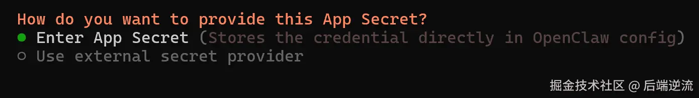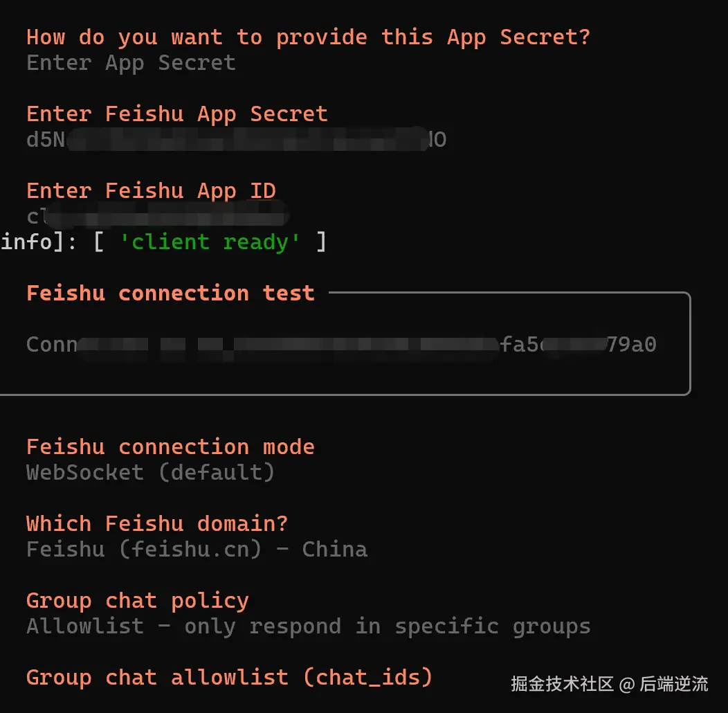 按回车确认,然后去飞书开发平台复制Secret粘贴到命令窗口