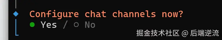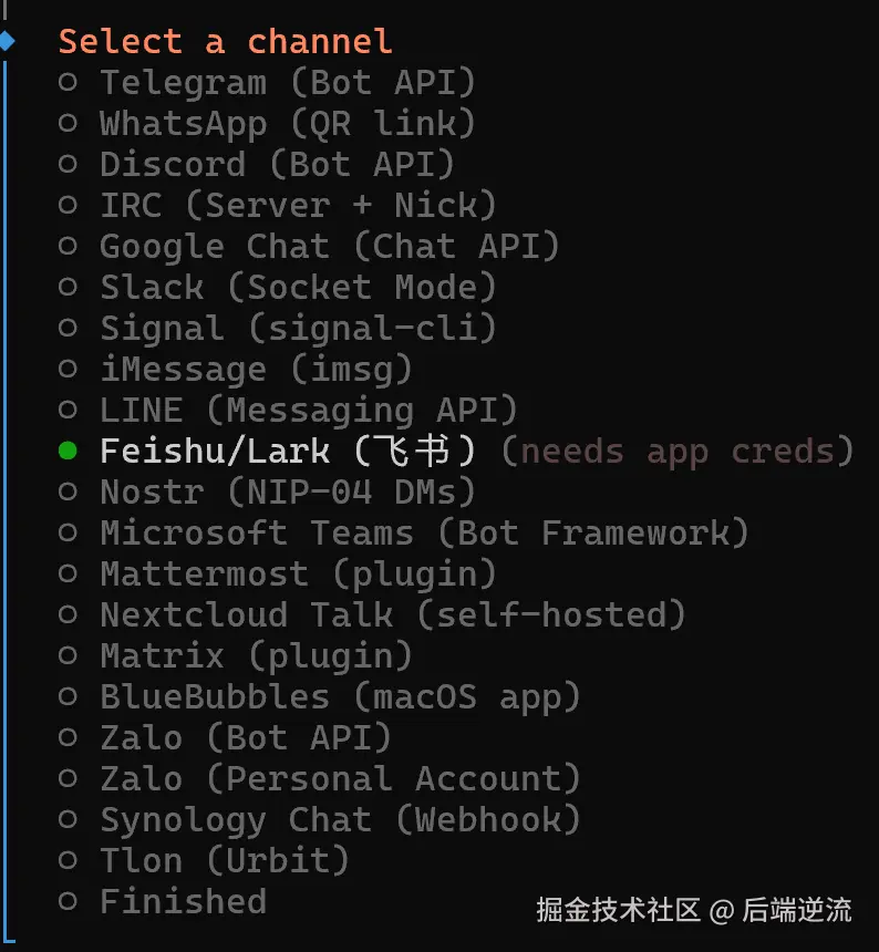 - 选择交互的渠道可以先跳过,后面再单独配置飞书