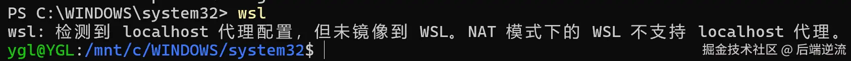 打开PowerShell,输入一下命令以下wsl命令进入Ubuntu,当然这个警告可以忽略