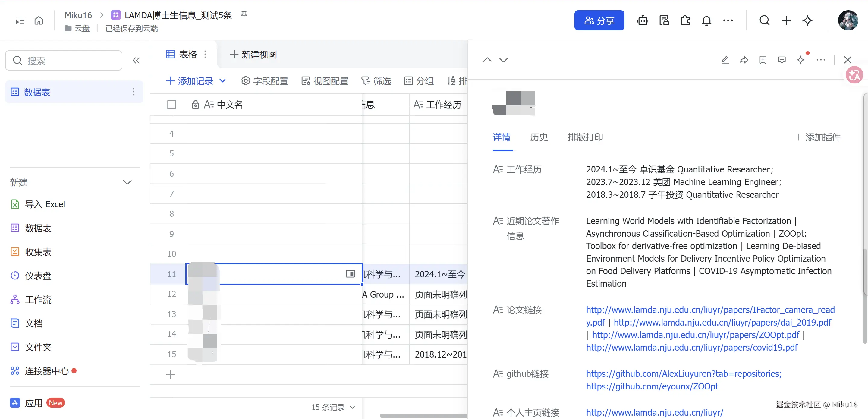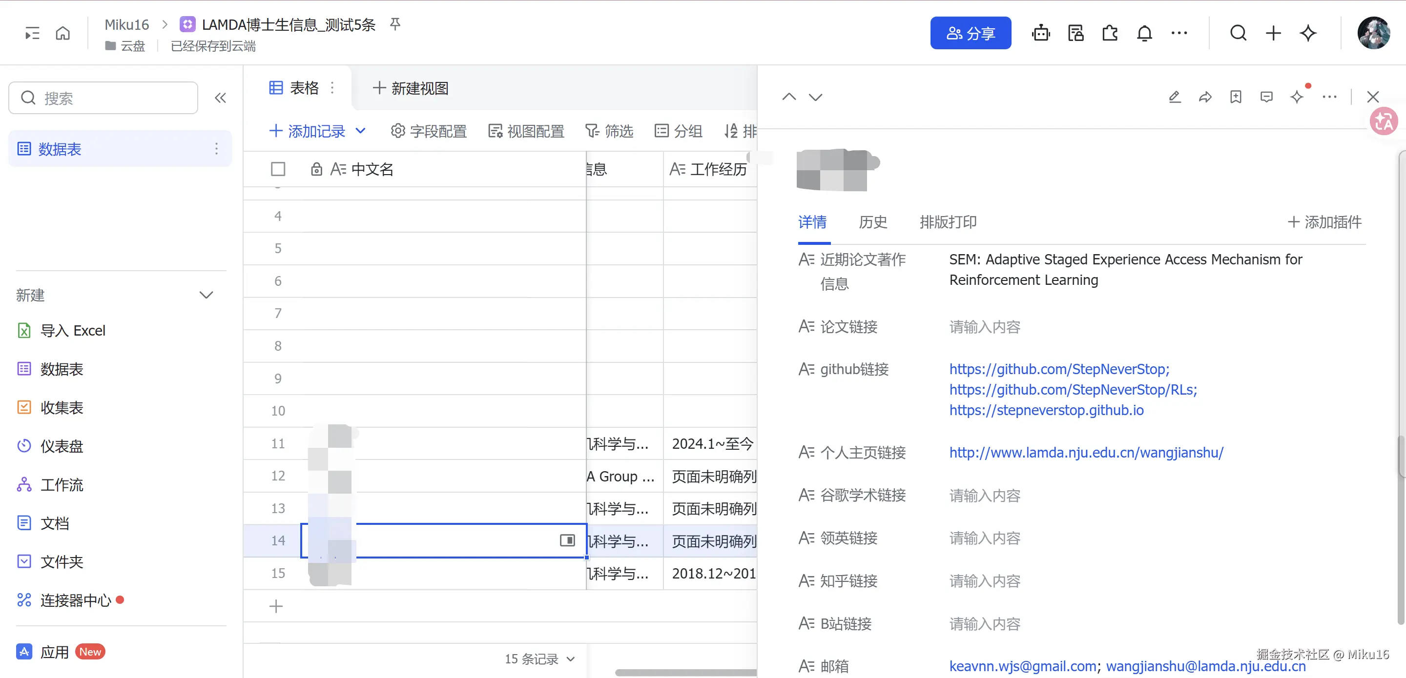 2、提取信息包括中文名,英文名,个人介绍信息、学术方向、学校和专业信息、工作经历、近期论文著作信息(包含论文名和论文链接)、github链接、个人主页链接、谷歌学术链接、领英链接、知乎链接、B站链接、邮箱等。