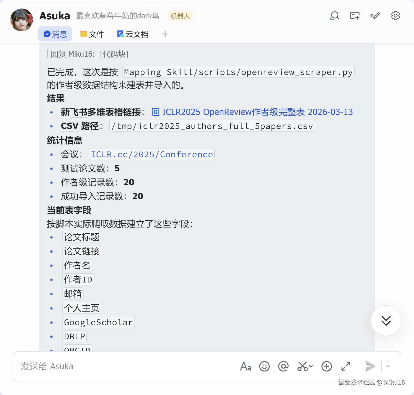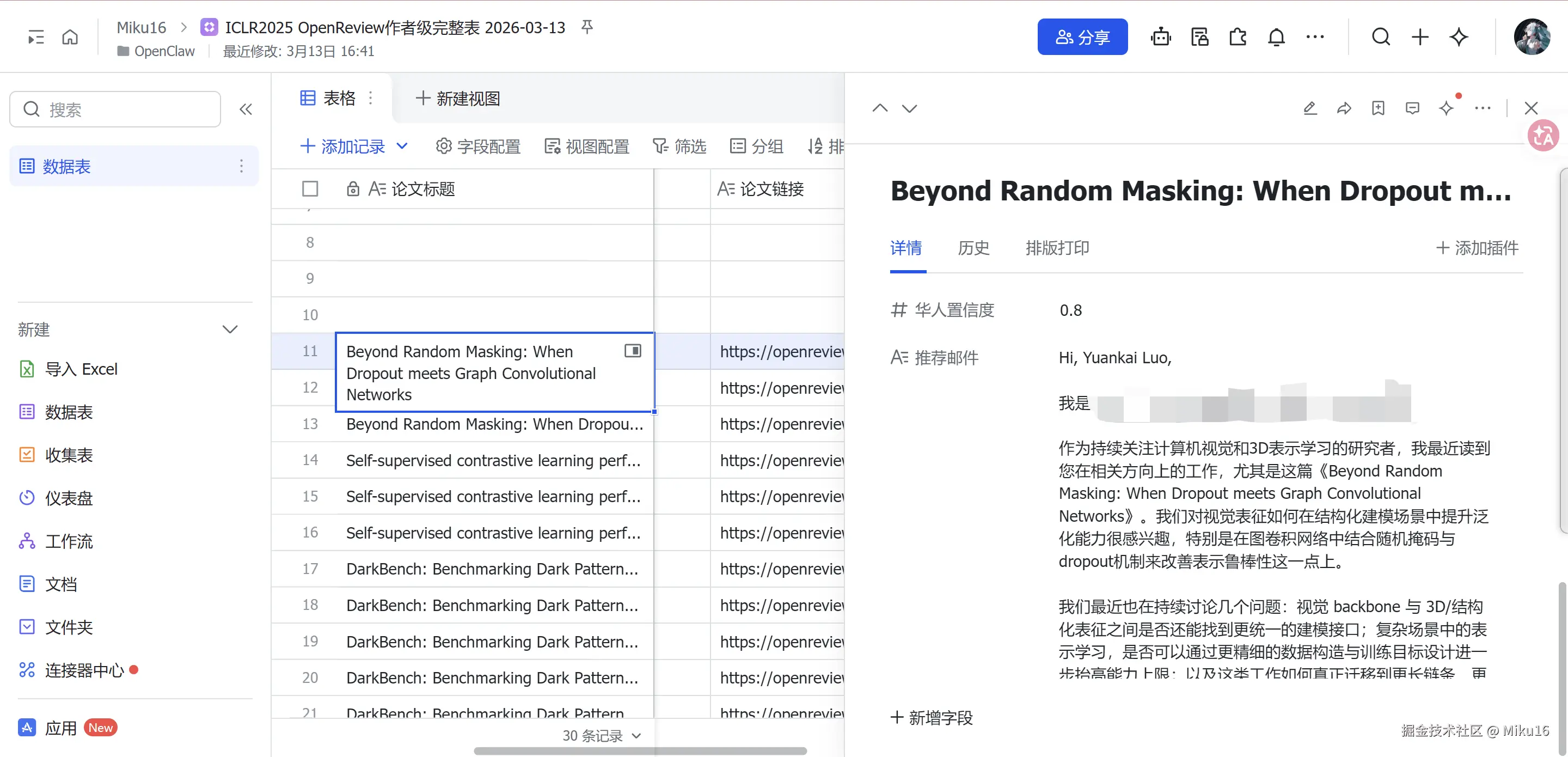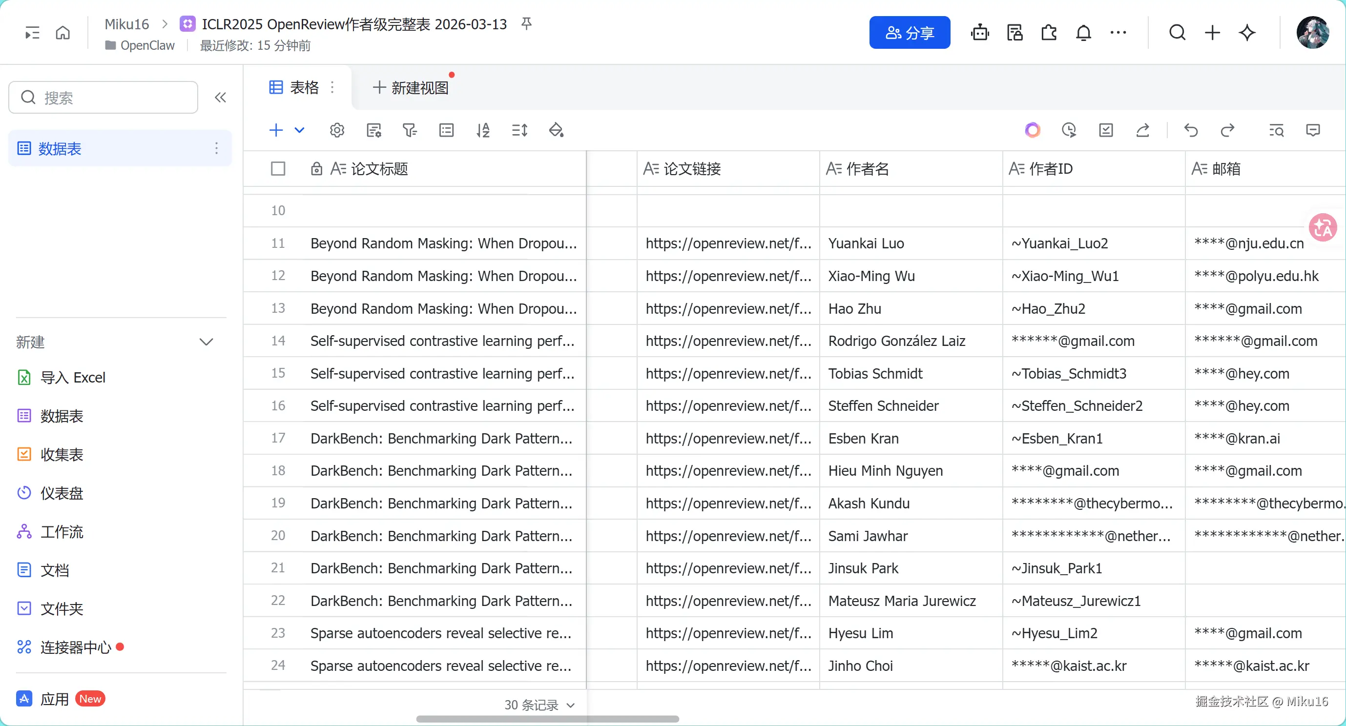 5. 创建新的飞书多维表格,按照Mapping-Skill/scripts/openreview_scraper.py 脚本中爬取的数据来创建相应字段